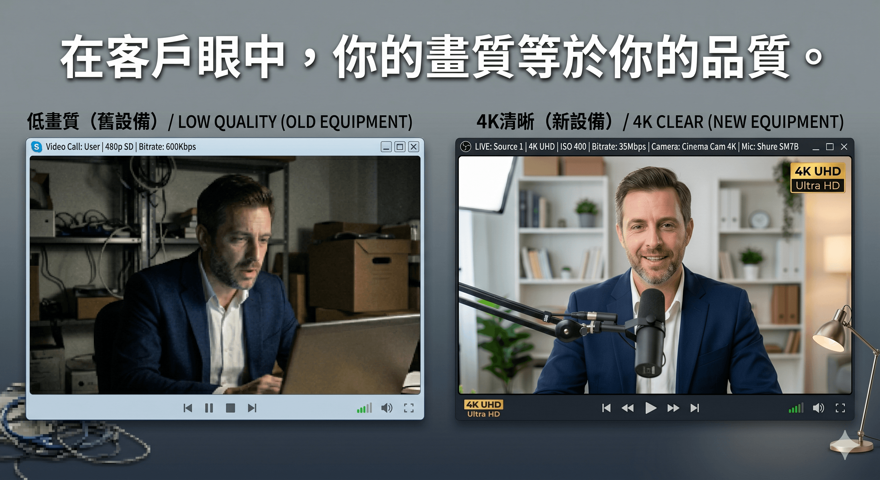 當你的對手使用 4K 自動追蹤鏡頭、無雜訊陣列麥克風,展現出如同電影般的專業質感時;而你的畫面卻卡頓、充滿回音,這在無形中向客戶傳遞了一個致命訊號:**「這家公司連溝通工具都打理不好,如何處理我的千萬訂單?」**